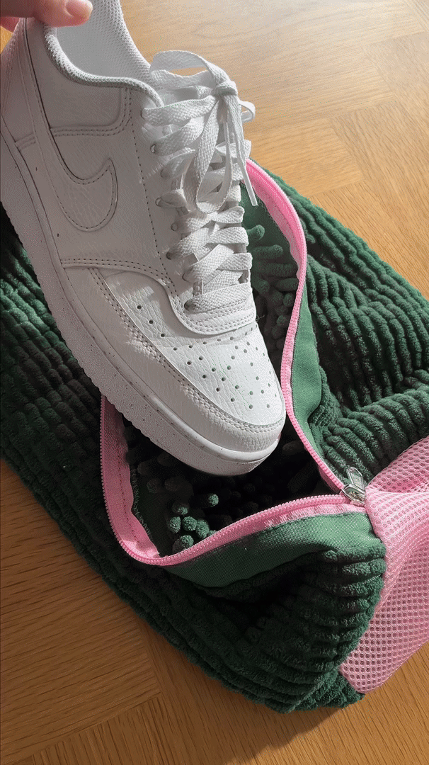 Mete los tenis, cierra la cremallera y ejecuta un ciclo delicado. El diseño de malla amortigua tus zapatos y ayuda a que el agua y el detergente lleguen a todas las superficies.